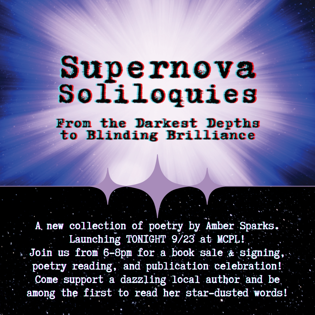 September 23, 2024 – Today is the day! Dandelion Scribes editor and local McCreary County poet/chemist extraordinaire Amber Sparks publishes her debut poetry collection. The book is called Supernova Soliloquies: From the Darkest Depths to Blinding Brilliance and explores the author’s life in two distinct chapters: “The Black Hole” and “The Supernova.” Moving from a world of darkness and deep suffering into a burst of healing and light and radiant energy, Amber takes us on a journey through her world of science & poetry, encouraging all who read her words to claim their rightful place among the stars.